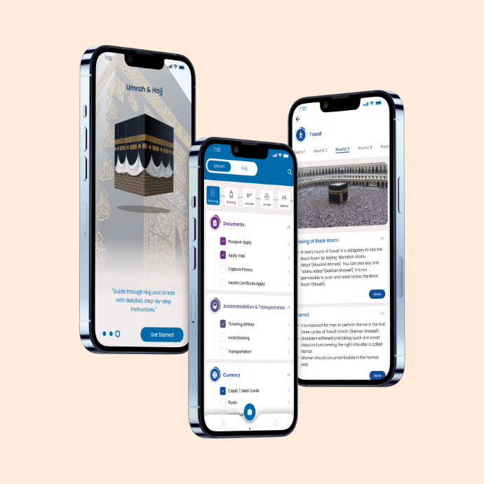 This project focuses on designing a complete Hajj and Umrah companion app that guides users through every stage of their spiritual journey. The app covers planning, packing checklists, travel preparation, on-ground rituals, step-by-step instructions for Umrah and Hajj, ziyarat locations in Makkah and Madinah, and guidance for returning home. The goal was to create an experience that feels simple, organized, and supportive for every pilgrim.